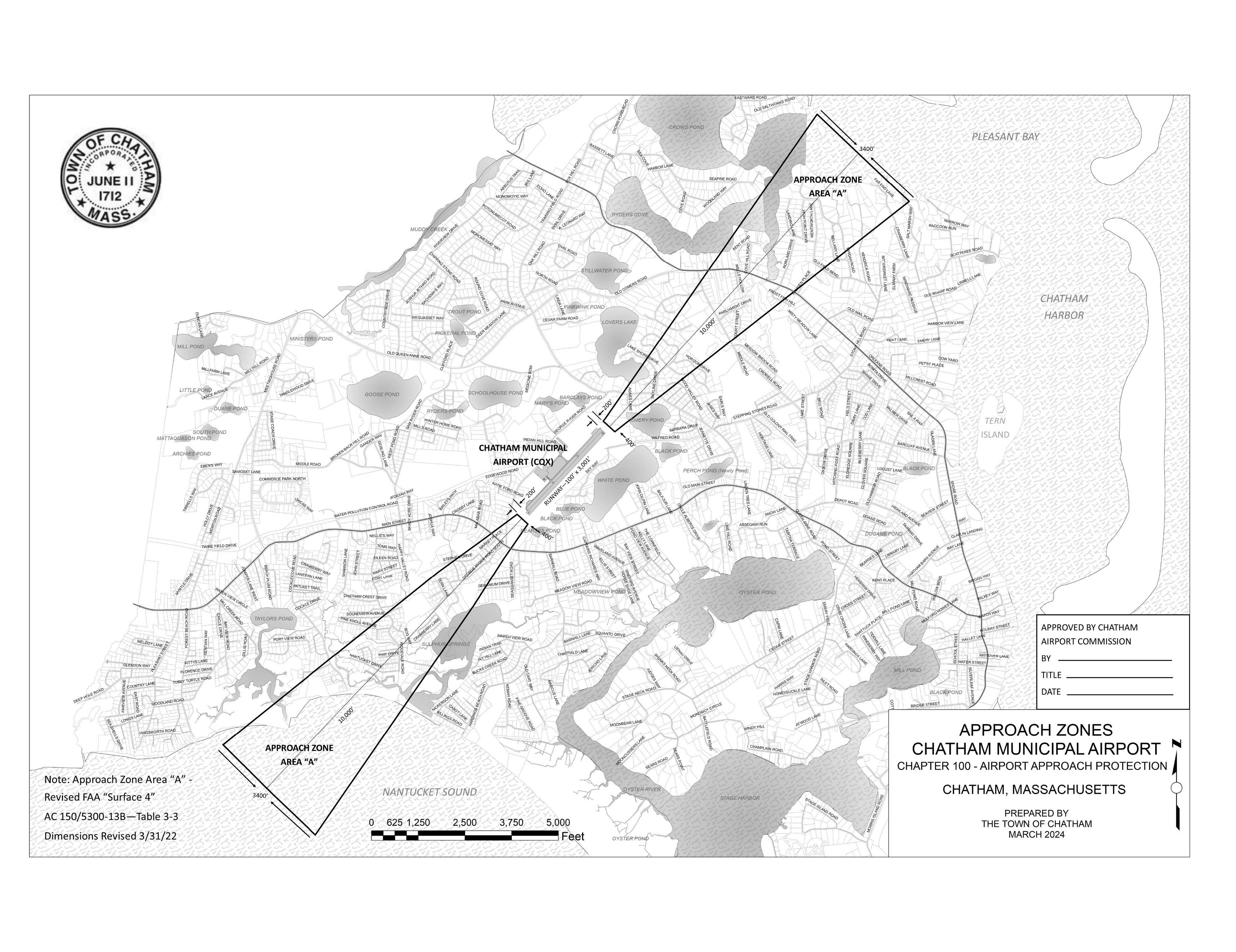 This article proposes to amend the Airport Approach Protection General Bylaw by updating the existing map reference in the Airport Approach Zone definition. Chapter 100 was first enacted in 1958 to prevent the creation of Airport Hazards. The definition of the “Airport Approach Zone” included a reference to a February 1958 Map on file with the Chatham Town Clerk. That February 1958 map is now outdated. Since 1958 there have been several changes to the airspace used by aircraft arriving and departing the airport, including: regulatory input from the Federal Aviation Administration (FAA) through its publication of Advisory Circulars (ACs) and safety improvements represented in the FAA approved Airport Layout Plan (ALP). These changes implement the Airport Commission’s ongoing efforts to improve safety for pilots, aircraft passengers and everyone on the ground in the Airport’s vicinity. The 1958 Map needs to be replaced with a map reflecting the reality of aircraft arrivals and departures today. As noted in the Article, a positive vote will result in the map of record changing to an updated “Map of Approach Zones Chatham Airport, Chatham, Massachusetts, dated March 2024.”